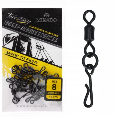 Standardowy krętlik w roz. 8 w komplecie z agrafką do szybkiego montażu. Niezbędny produkt przy produkcji karpiowych zestawów końcowych. Całość wykończona czarnym matem.