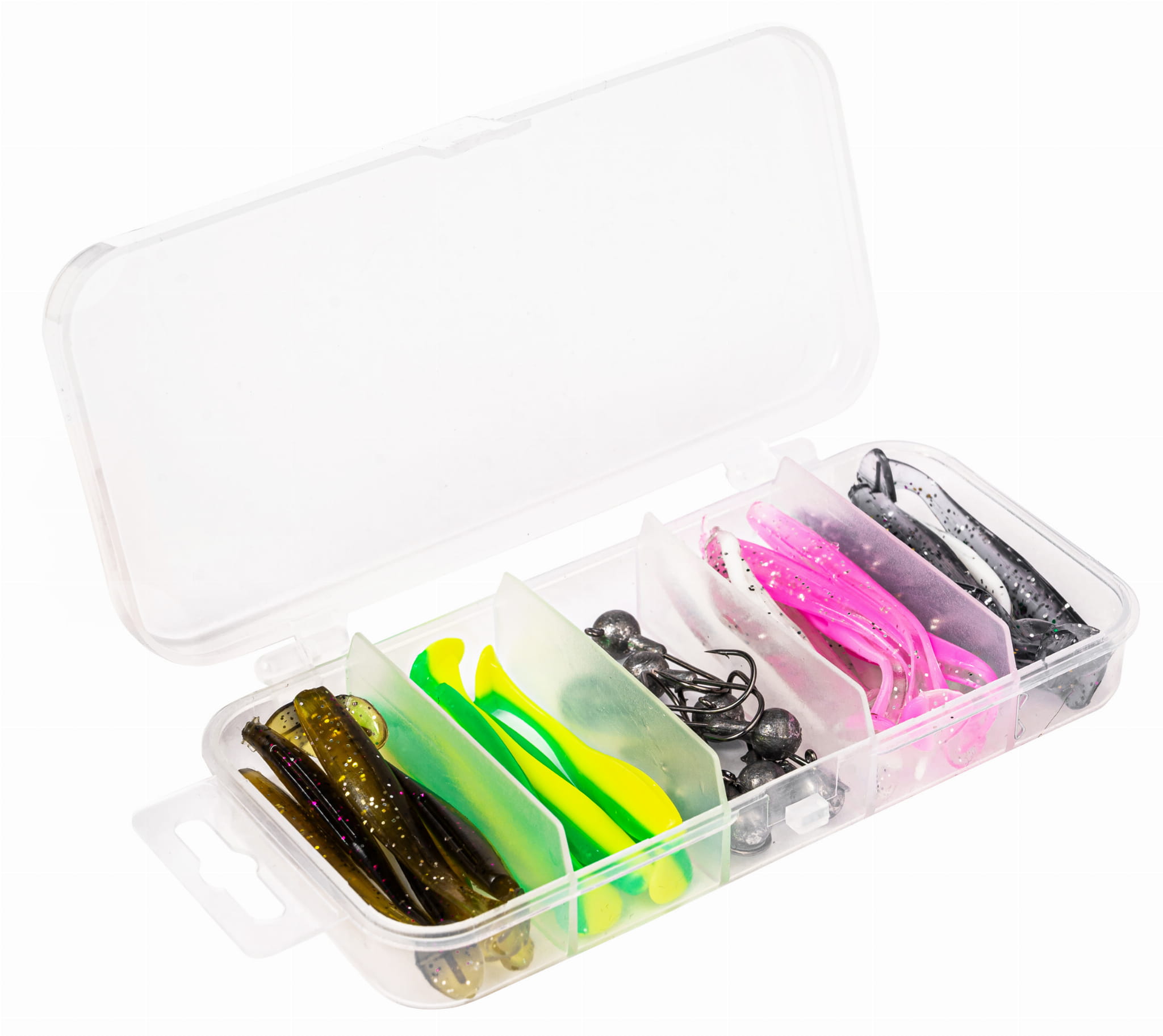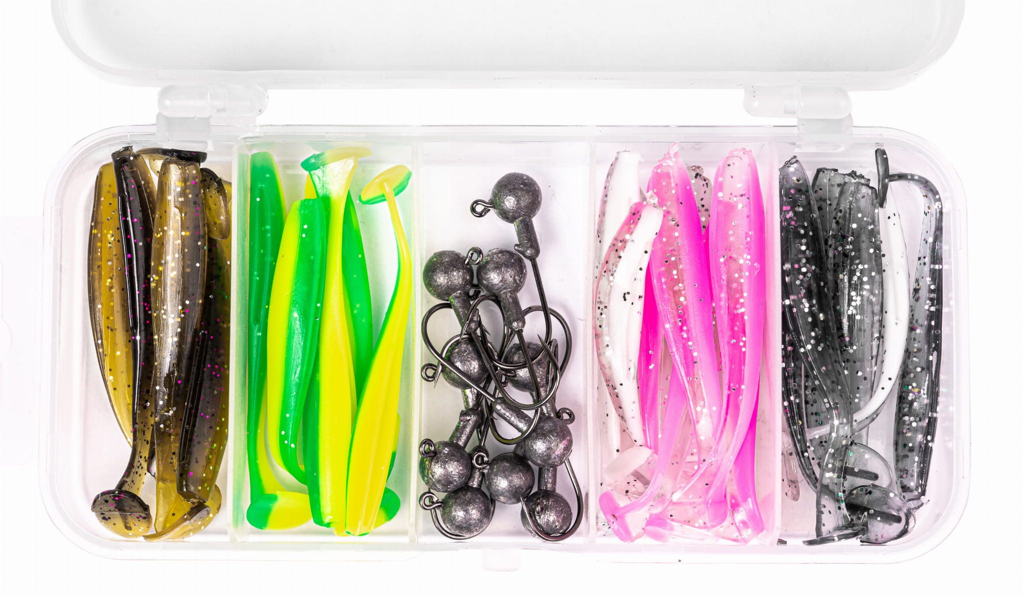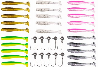 25 sztuk gumek spinningowych typu ripper przeznaczonych do połowu drapieżnika. Jaskrawe kolory skutecznie wabią rybę drapieżną. Zestaw idealny dla początkujących. Zapakowane w pudełko dzięki czemu przynęty są szybko dostępne do wymiany na zestawie. 10 główek jigowych do uzbrojenia w zestawie.